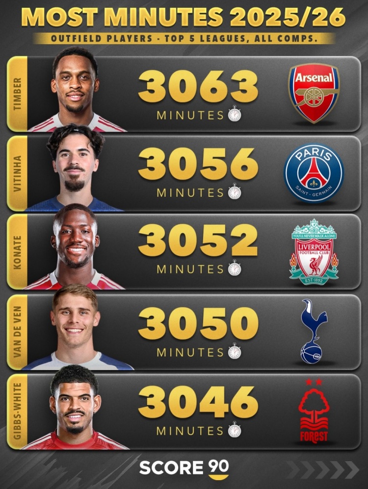 21、廷伯(阿森纳):3063分钟