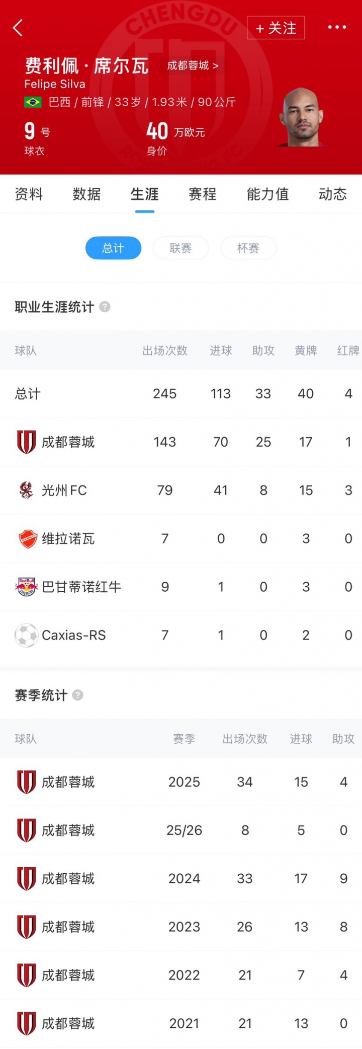 费利佩现年33岁,2021年7月加盟成都蓉城,转会费149万欧,在中国效力即将满5年。费利佩代表蓉城出场143次,打进70球送出25次助攻,与球队当前合同2026年12月31日到期。